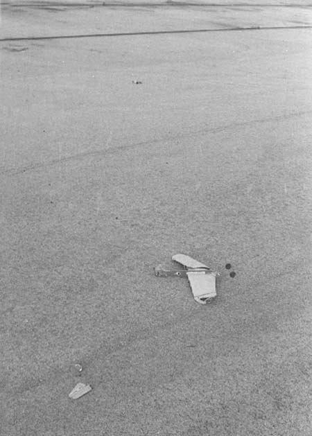 My Lil' Jumpin' Bean lays shattered on the tarmac at Samuels Field, April 29, 1973. My log doesn't say what happened. My Carl Goldberg flying handle can be seen near the top of the photo laying on the ground.