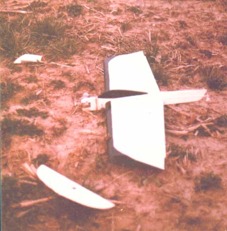 Denny Greenwell's Flite Streak lays damaged on the dirt at McIntyre Field, April 11, 1975. As noted in my logbook, the crash was caused by the clutch slipping on his U-Reeley flight handle. The damage looks repairable to me.
