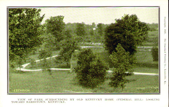 This postcard shows the entrance to Federal Hill as it existed when it became a state shrine. This entrance still exists, except these days it is the park service entrance, and runs a straight perpendicular line from the highway all the way up to the home. It turns and goes behind the home and through a breezeway that was created when public restrooms and a carriage house was added in the 1950s. This road was nice, smooth asphalt pavement until the mid 1990s, when someone thought that coating it with some sort of light brown crushed rock chip-seal mixture would look more authentic. I think it looks awful! A couple of sinkholes have showed up in this area that is depicted. I've heard tell that concrete rubble and large rocks were dumped into to keep it filled. | BACK || |