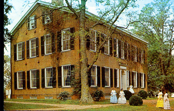 This color postcard is circa the 1960s, and shows some of the tour guides in what they then believed were historically correct dresses. The large tree standing at the corner of the home was taken out in the early 1980s; the ivy growing up the side was eventually eradicated. Note the open third-floor windows, something which was no longer necessary after air conditioning was installed in the home. The front of the home faces in mostly a northern direction, so this photo shows the home's eastern side. The third floor had only one room, and when I worked there (1988-1991), it was fixed up as a 19th-century nursery. Legend has it that a ballroom or music room once filled out the other half of the home's third floor on the west side of the hallway. A fire at some point in the mid-19th century damaged the home, and the roofline was adjusted to compensate for the loss of the room. My theory? I'm not sure Federal Hill ever had a west wing. The home was built in stages, and I don't believe the legend about the fire. I never had a chance to know the guys who worked on the restoration that took place many years ago, so those guys may have a better idea about what was there than I do! The Stars Outside the Home: Depending on your luck, your tour guide may or may not know what he or she is talking about when you visit Federal Hill. One thing they may tell you that is rooted in truth is the use of the number 13. John Rowan was a Federalist, mean he was a believer in the establishment of a strong Federal government (hence the name Federal Hill). Rowan designed the home to reflect his Federalist beliefs: Each flight of stairs has thirteen steps; there are thirteen windows across the front of Federal Hill; the ceilings are 13' high; and the walls are 13-inches thick. Don't believe your guide if he/she says there are 13 stars on the exterior of the home. The stars are there solely to help keep the walls straight, not as decorations or a nod to any political belief. I do like them, however! Trivia: The third-floor nursery also had a door to the attic, and it was wonderful! Besides storage, you could see the original roof slats from the home's first roof, as well as some interesting construction details. Inside this little attic space is a hatch that takes you out the roof of the home. You can see it on the roof, it looks like a rectangular flat box, but its a hatch that gives maintenance guys and roofers easy access to the roof. After an extremely hard windstorm, you might find this hatch cocked up or raised a bit. I noticed this after our recent winter storm (Jan. 10, 1999) as I drove past the park. The nursery also had a large, silver-plated box that carried an inscription that it held the master blueprints for Federal Hill. I would love to have seen them, but the box was empty. These plans were created many years ago when the state purchased the home. Apparently somebody wanted a very unique souvenir. | BACK | |