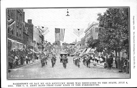 This parade was held during the dedication of Federal Hill and My Old Kentucky Home as a state shrine. The caption reads: "Bardstown on day My Old Kentucky Home was dedicated to the state, July 4, 1923. The U.S. Army Band from Camp Knox in the foreground." This photo was taken from the front of the Nelson County Courthouse looking north down Third Street. It is another of the series of "dedication day" postcards, and has the icky green watercolor tinting; however on this one, I scanned in black and white; it just looked better! Points of interest: Notice the single light hanging down in the middle of the photo. Also the band looks intent during its march, but there's a dog on the right side of the street that looks intent on chasing the tuba player! Town looks right festive, with plenty of flags a-flying and bunting all over downtown. | BACK | |